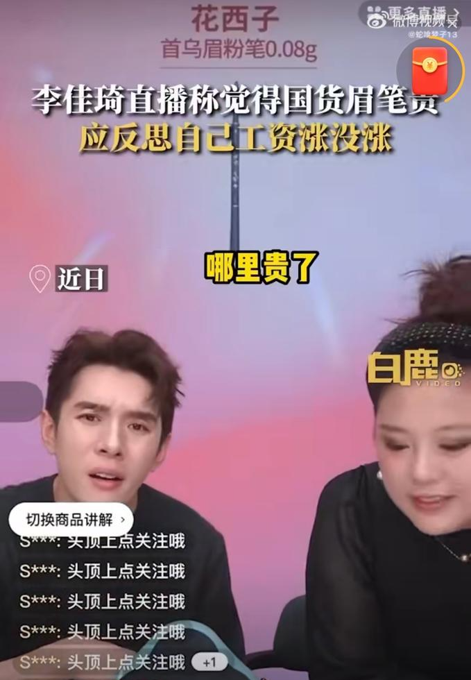 2023年9月10日,头部主播李佳琦在直播间带货“花西子”产品,推介一款79.9元的眉笔时,有网友评论“花西子眉笔越来越贵了”。李佳琦当即回应“哪里贵了,国货很难的”,并提醒消费者要从自己身上找原因,“这么多年工资涨没涨,有没有认真工作”。