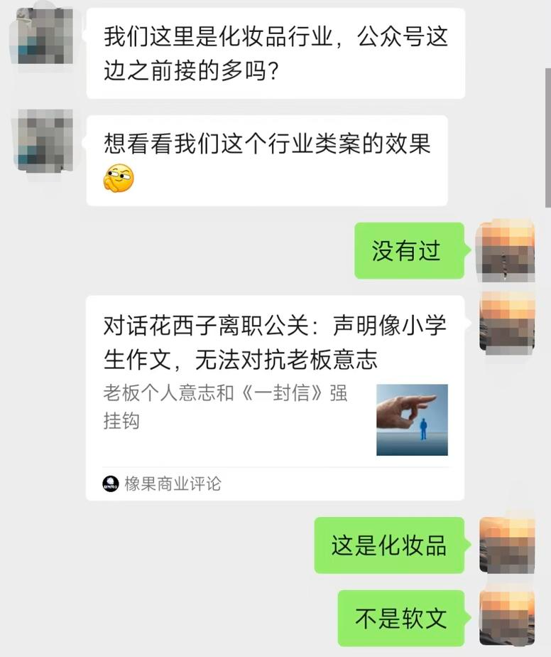 “他们提交的化妆品行业竞争证据有两个,一个是我的微博曾经转发过化妆品问题的媒体报道,另一个是,他们以匿名客户身份询问公众号广告投放价格,值班小编进行了回复,被认定是在做化妆品推广服务。”